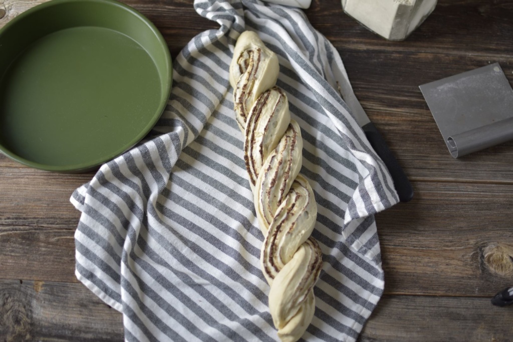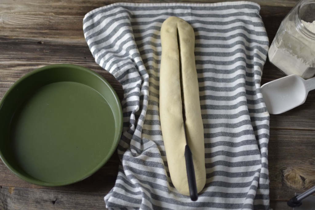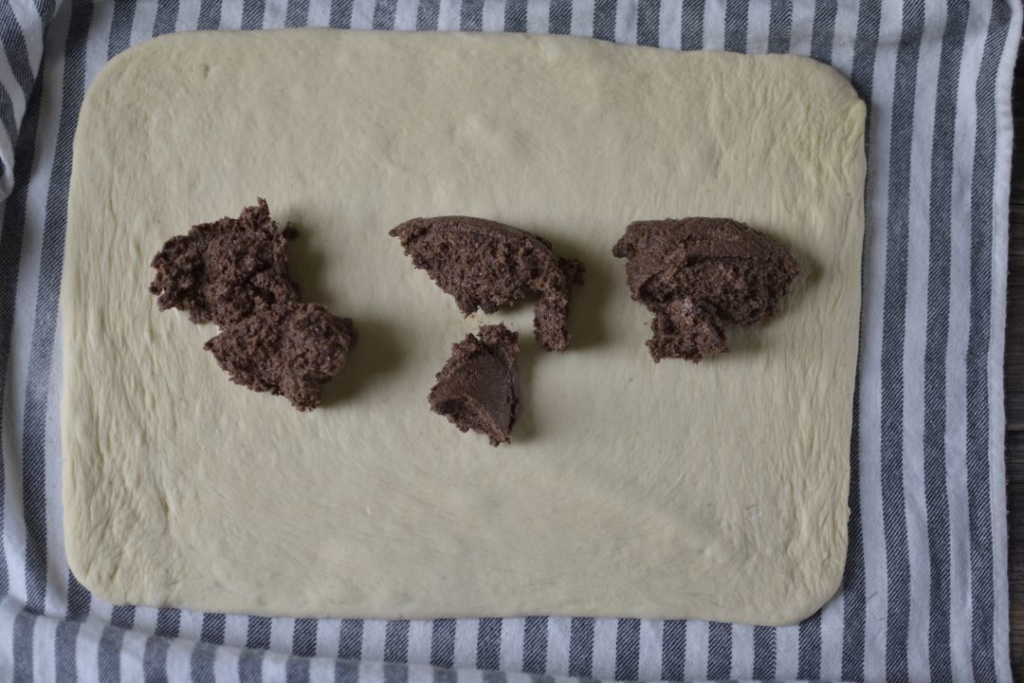 - Sabah hamur kabarınca tezgahta 45×35 cm ebadında dikdörtgen şeklinde açtım. İçine iç karışımı sürdüm